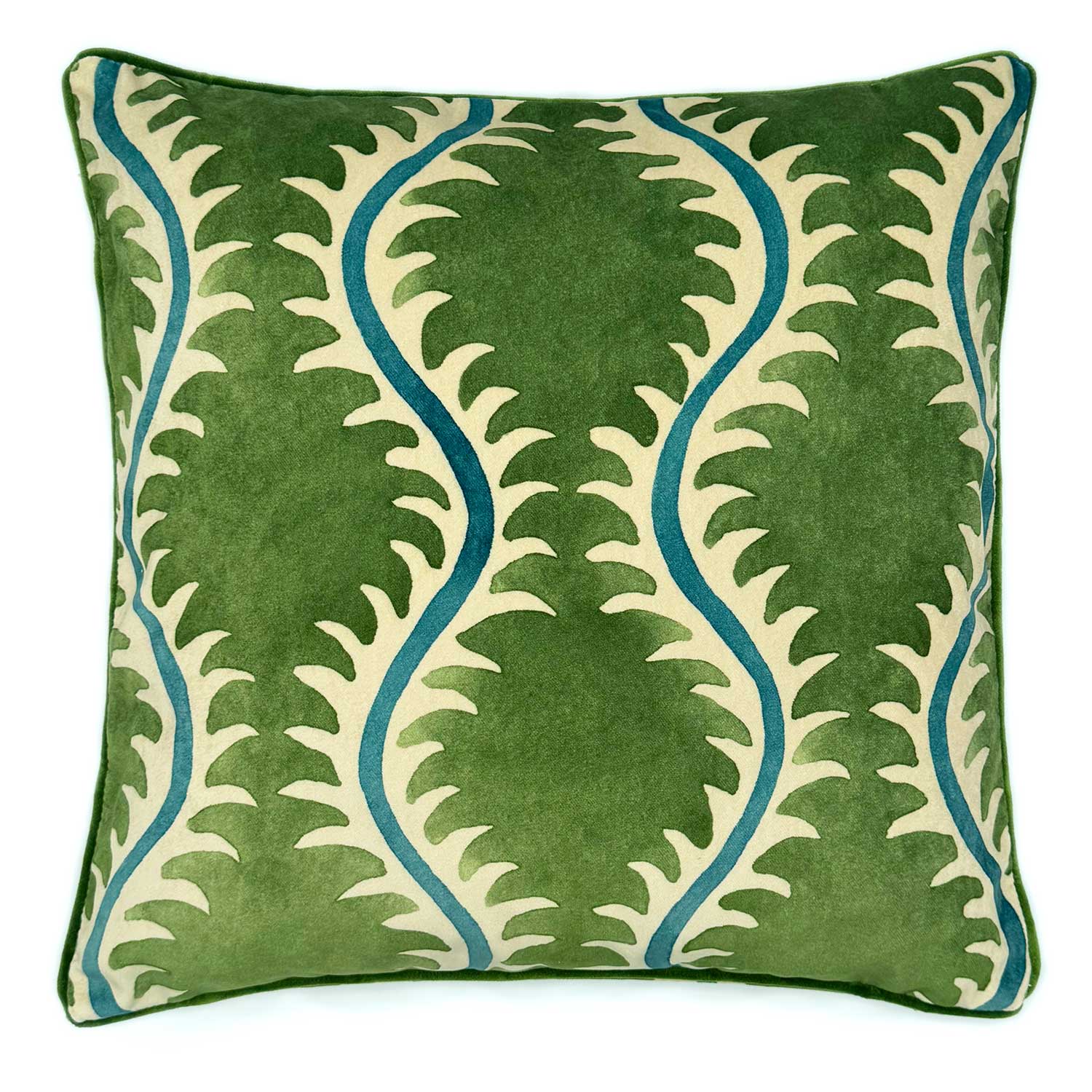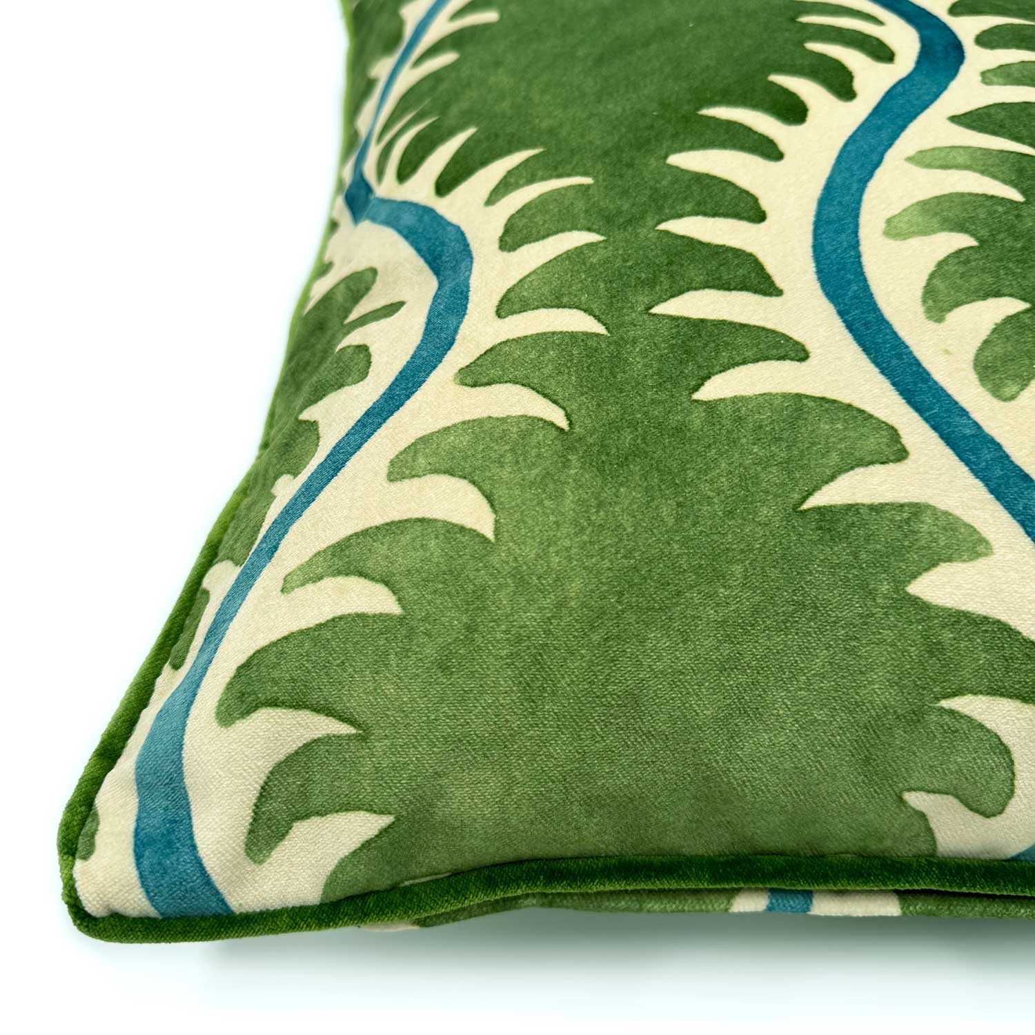 A green, blue and off white velvet cushion with a all-over repeat pattern and velvet piping