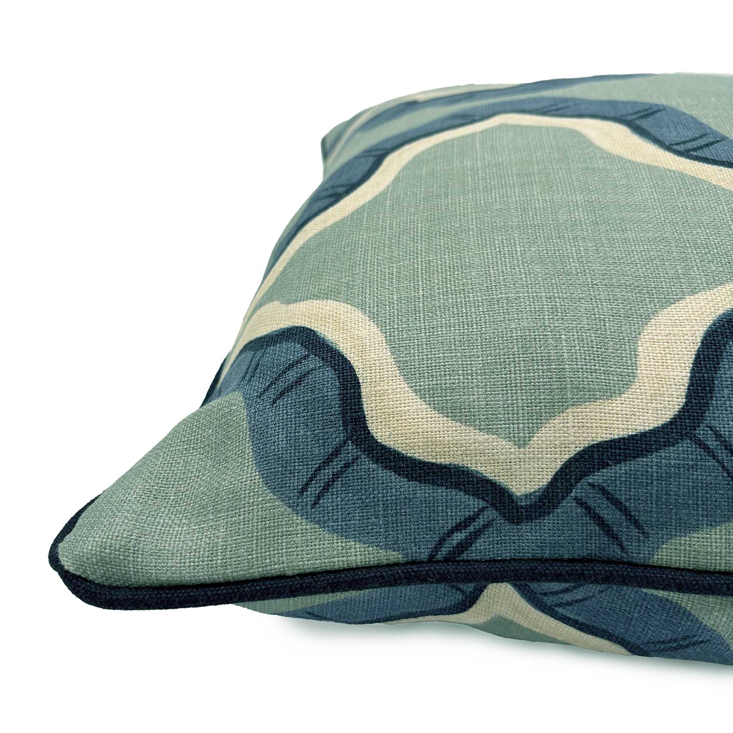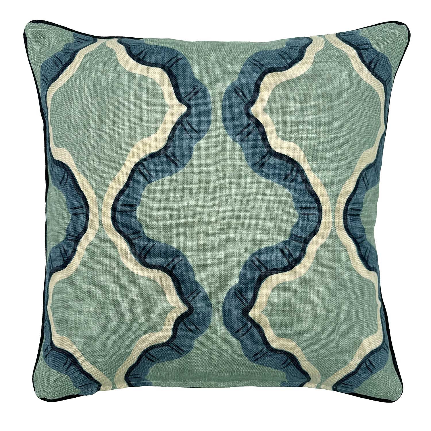 Blue and green linen cushion with a mirrored ribbon pattern